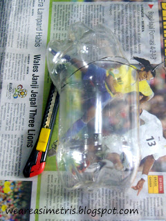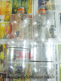 - kemudian potong botol sesuai pola menggunakan cutter dan rapikan dengan gunting [hati-hati ya menggunakannya]