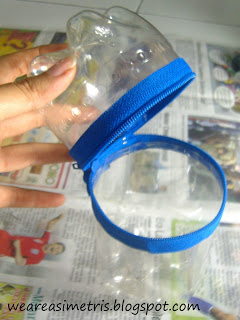 - lem resleting pada bagian luar botol, dari arah pangkal resleting. Lem dulu bagian bawah sampai seperempat area,, bila sudah, lem bagian atas sampai menutup seluruh tepi botol, untuk diperhatikan ya, ketika mengelem, jangan sampai rel resleting ikut kena lem, jadi beri jarak rel resleting dengan tepi botol.